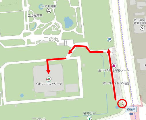 名古屋城方面に向かい、城に入らず左側に行くとすでにドルフィンズアリーナ(愛知県体育館)が見えるので分かると思います。