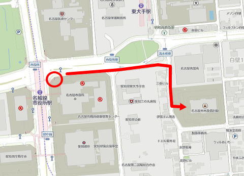 あとは2番出口から外に出て、地図を参考に約5分ほど歩けば、名古屋市市政資料館に着きます。