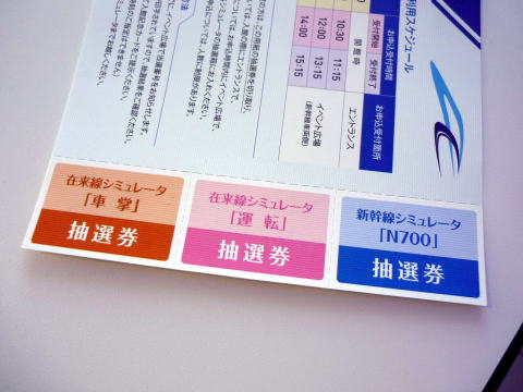 新幹線N700系、在来線車掌、在来線運転手の3つの券が付いてますので、それぞれ乗ってみたいと思うコ−スの箱に抽選券を入れます。