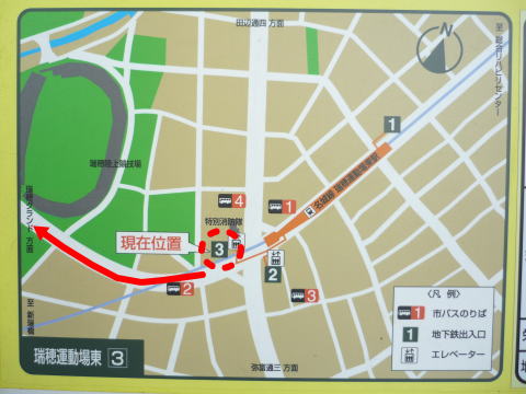 名古屋駅からだと、桜通線の瑞穂運動場西駅を目指しましたが、金山駅からだと名城線の瑞穂運動場東駅を目指します。