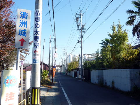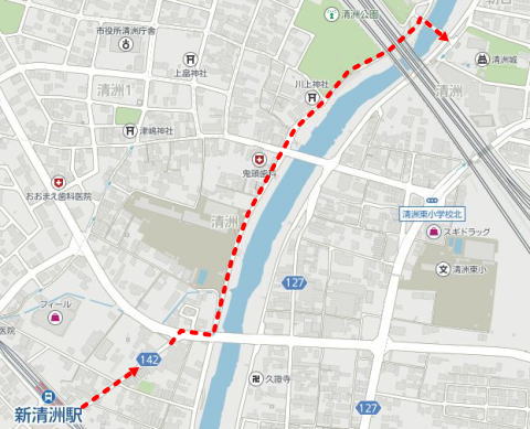 まず新清洲駅を出て真っ直ぐ進んで、突き当りを右に曲がり、橋の手前を左に曲がってあとまっすぐ。