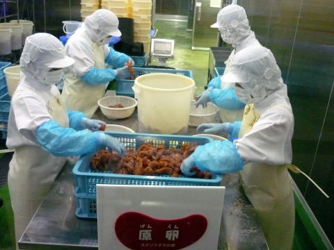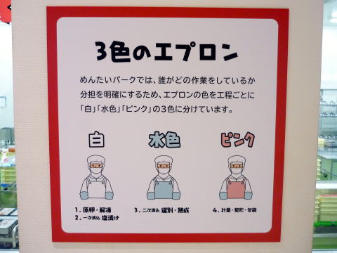 明太子作りはいくつかの行程に分かれていて、それぞれエプロンの色でどんな仕事を担当しているのかという事が一目でわかる様になってます。