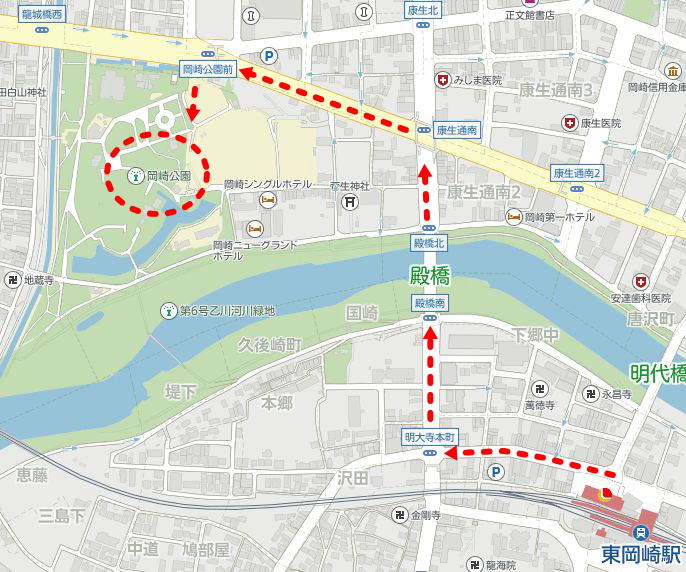 殿橋を過ぎれば岡崎城が左手に見えてきますので、康生通南の信号で左に曲がってまっすぐ歩けば岡崎城に着きます。