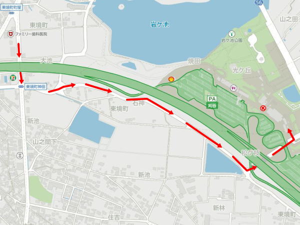 コツとしては、高速道路に沿って歩いて行き、左に1回曲がると刈谷ハイウェイオアシスに着きます。