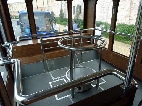 普通のバスとはちょっと違って、木製の枠を使用した青い椅子が並んでいました。