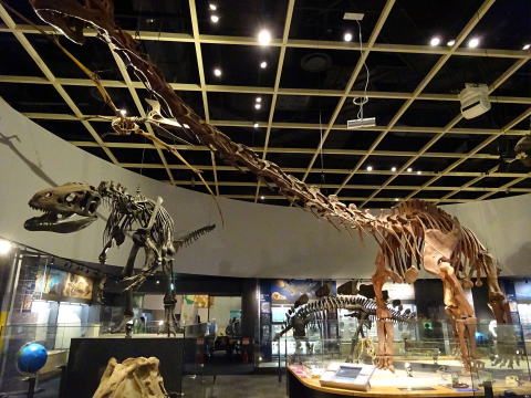 トリケラトプスやエドモントサウルスなど、12体の恐竜の骨格標本を見る事ができます。