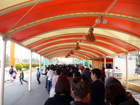 園内を歩いて移動していたり、建物の中でのアトラクションならともかく、特に土日の開園前には必ずと言っていいほど並ぶので、少し厚着をしていった方がよいです。