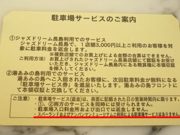 つまり、遊園地やアンパンマンミュ−ジアムでは、駐車場サ−ビスがありませんが、ジャズドリ−ム長島で¥3,000以上の買い物をすれば駐車場料金がタダになるということです。