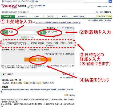 また電車の乗り換え方法を調べるには、Yahoo!路線情報が便利です。