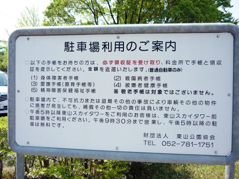 東山動物園には、なんと、一ヶ所だけですが無料駐車場もあります。