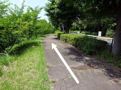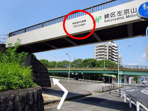 そのまま歩いて行くと、【緑地前歩道橋350.55KP】という歩道橋が上を通っていますので、これをくぐってすぐ左に曲がります。