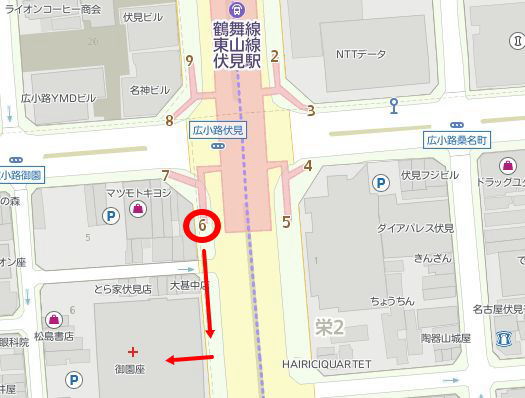 伏見駅に着いたら、6番出口から外に出て、まっすぐ歩くと御園座が見えてきます。