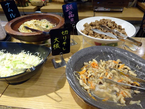 バイキング形式で、大きな皿におばんざいが盛ってあるので、好きなものを皿に取っていくスタイルです。ちなみにおばんざいは日替わりみたいなので、来る度に違うものを食べる事ができます。